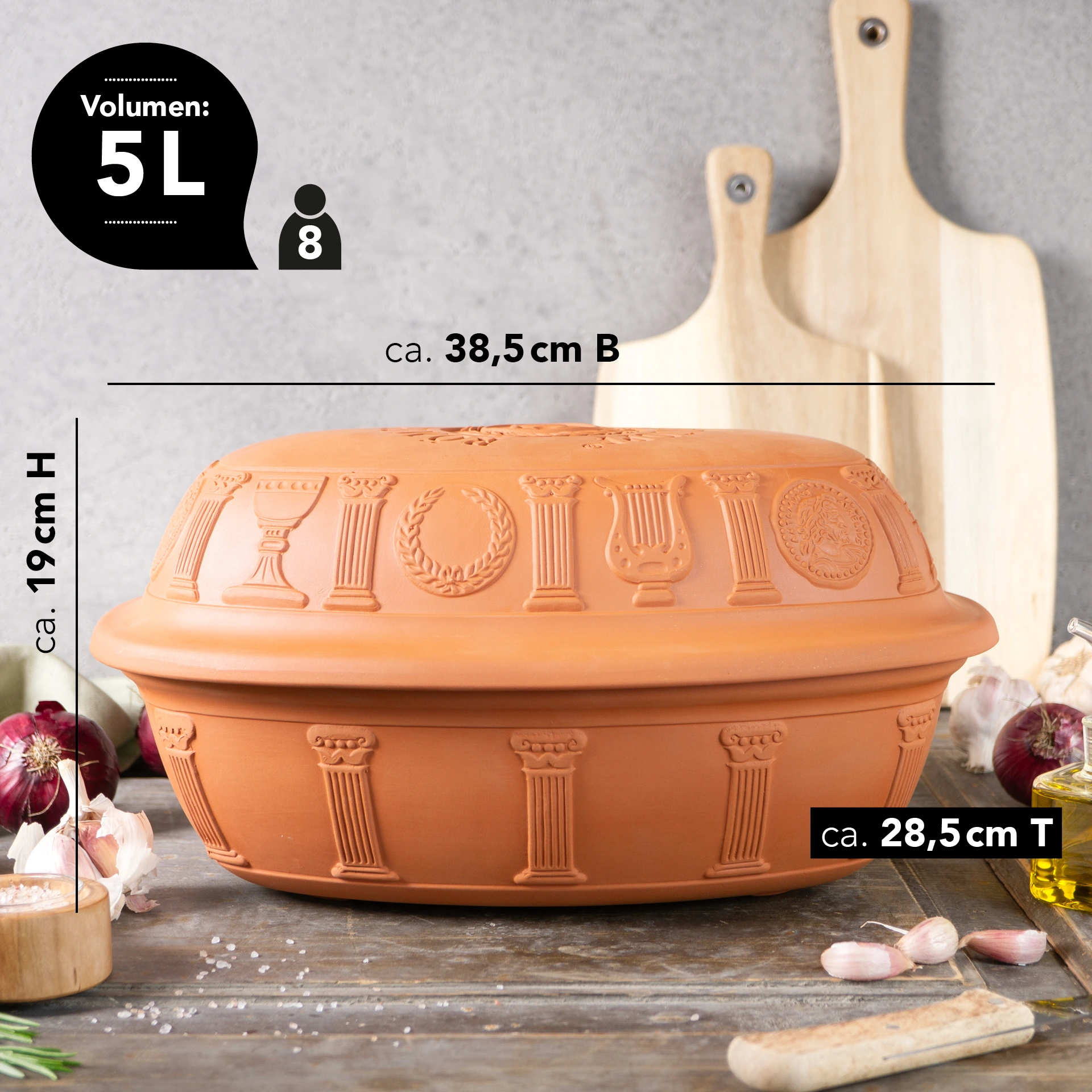 Mit seinem klassischen, antiken Design ist dieser Römertopf nicht nur ein praktisches Kochutensil, sondern auch ein echter Hingucker. Die Außenfläche des Bräters ist mit drei traditionellen Motiven verziert: einer Lyra, einer Säule und dem Portrait eines antiken Kaisers. Der Deckel wird von einer lorbeerumkränzten „50“ geschmückt, die das Jubiläum stilvoll feiert.