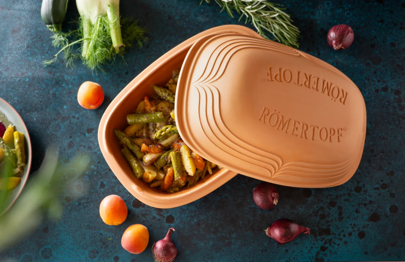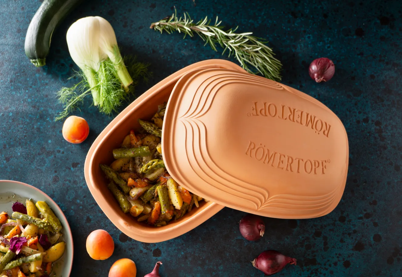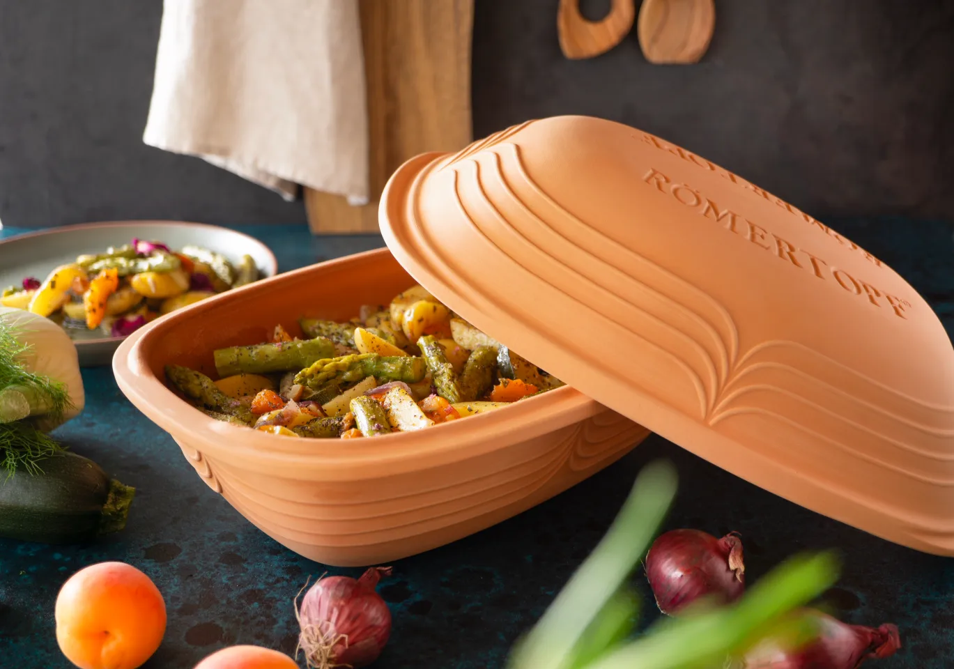 Tradition trifft Funktion – Römertopf Rustico für bis zu 4 PersonenMit dem Bräter Rustico 3 Liter setzt Römertopf auf bewährte Tonqualität und charaktervolles Design. Das Modell ist ideal für alle, die gerne unkompliziert, aromatisch und mit natürlichen Zutaten im Ofen garen – ob Auflauf, Fleischgericht oder Gemüse-Kreation. Alles kommt in einem Schritt in den Bräter, wird in den Ofen geschoben und gleichmäßig gegart. Einfach, effizient und ohne ständiges Nachschauen.Die liebevoll gestalteten Naturmotive auf dem Deckel – mit Huhn, Kuh und Ackerfrüchten – unterstreichen den rustikalen Stil und machen den Bräter auch optisch zu einem Blickfang. Perfekt geeignet für Haushalte mit bis zu vier Personen.Ofenfrische Gerichte – ganz einfach zubereitetMit einem Fassungsvermögen von 3 Litern bietet der mittlere Rustico-Bräter ausreichend Platz für abwechslungsreiche Rezepte. Er ist sowohl für traditionelle als auch moderne Küchen geeignet und überzeugt durch langlebige Verarbeitung sowie die typischen Eigenschaften des Römertopf-Tons: gleichmäßige Wärmeverteilung und zuverlässige Garergebnisse.Die Reinigung gelingt mühelos per Hand oder in der Spülmaschine – damit der Bräter schnell wieder einsatzbereit ist. So wird die Zubereitung im Alltag besonders praktisch.