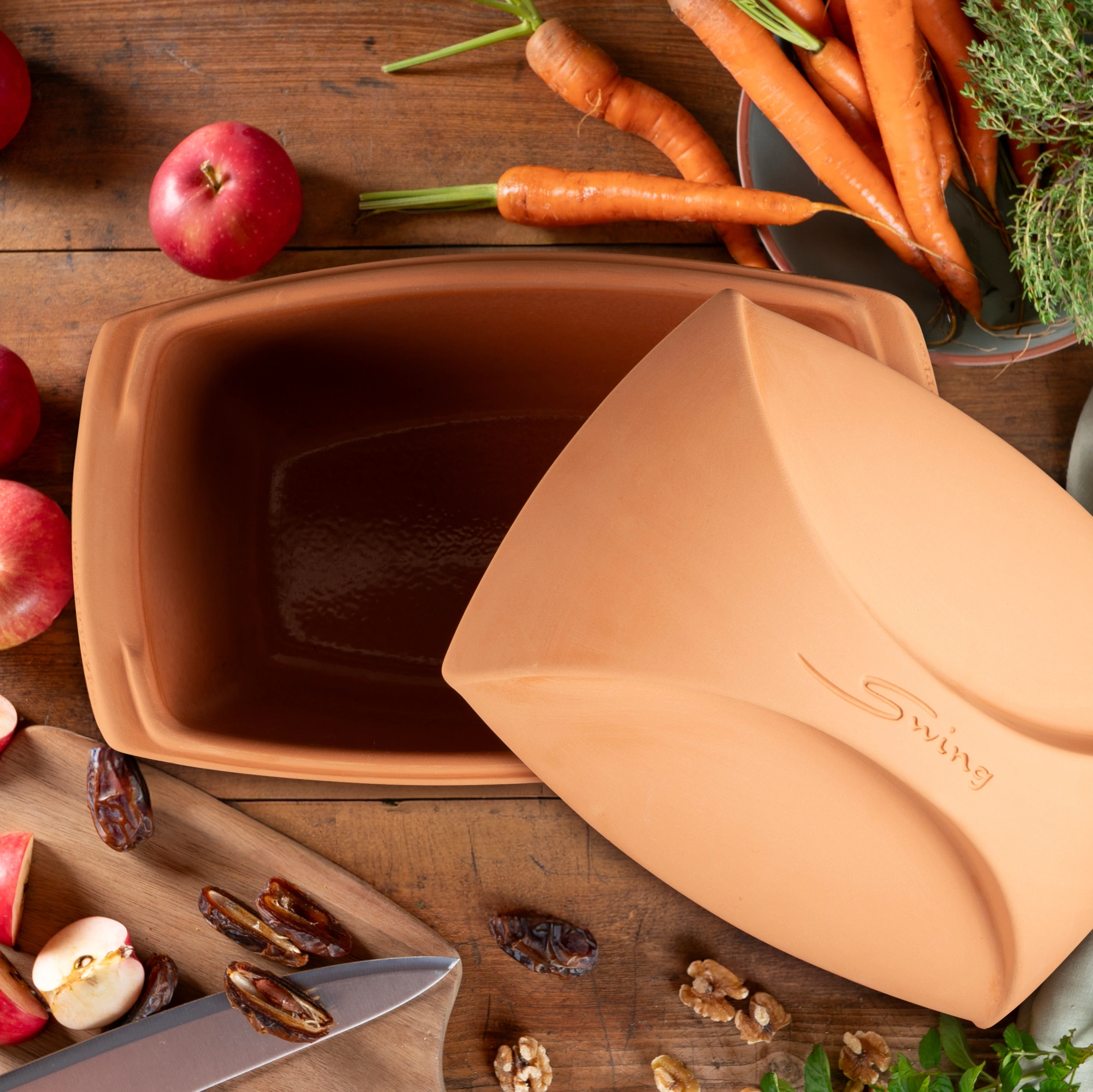Wie alle Römertöpfe nutzt auch der Bräter Swing das bewährte Dampfgar-Prinzip: Der Deckel wird vor dem Gebrauch gewässert, wodurch die feinen Poren des Tons Wasser speichern. Beim Erhitzen entsteht im Inneren eine natürliche Dunstschicht, die für schonendes Garen sorgt. Das Gargut bleibt saftig und gleichmäßig gegart – ganz ohne Zusatz von Fett oder Öl.