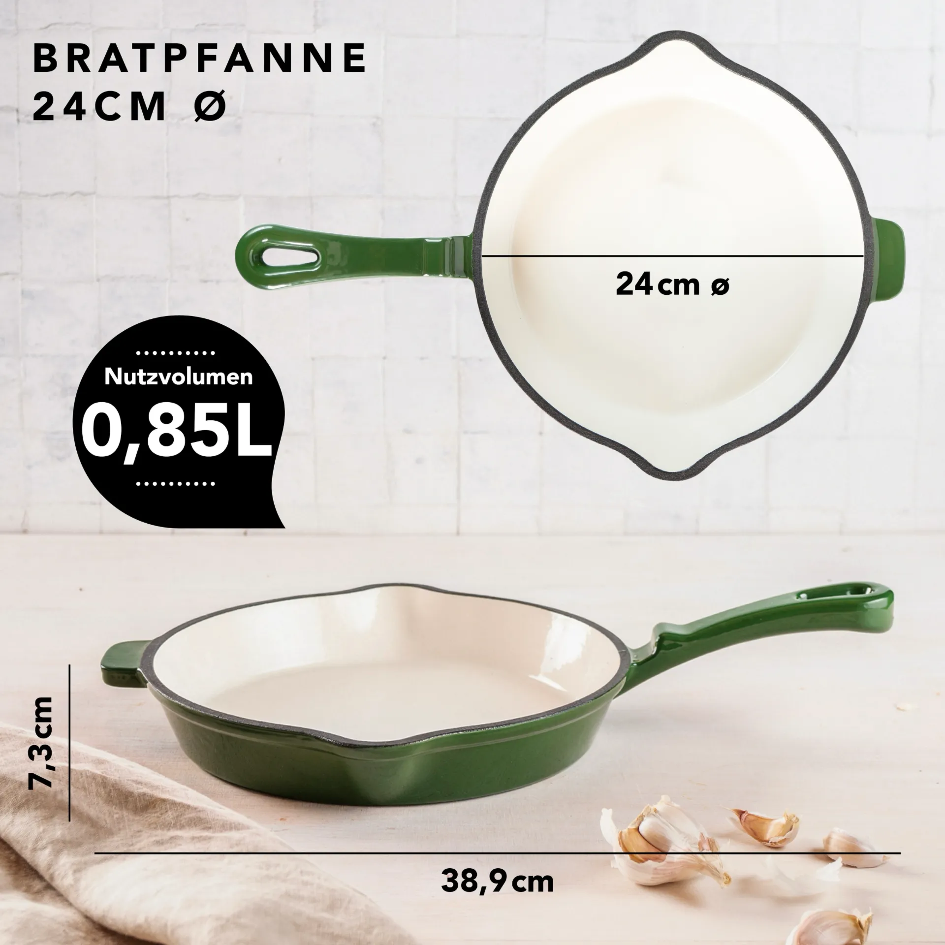 Die 24-cm-Bratpfanne ist der kompakte Allrounder für 1–2 Portionen: ein Steak, zwei Fischfilets, eine Portion Bratkartoffeln oder ein Spiegelei-Frühstück. Sie ist wendig, leichter als die große Variante und perfekt für den schnellen Einsatz unter der Woche.