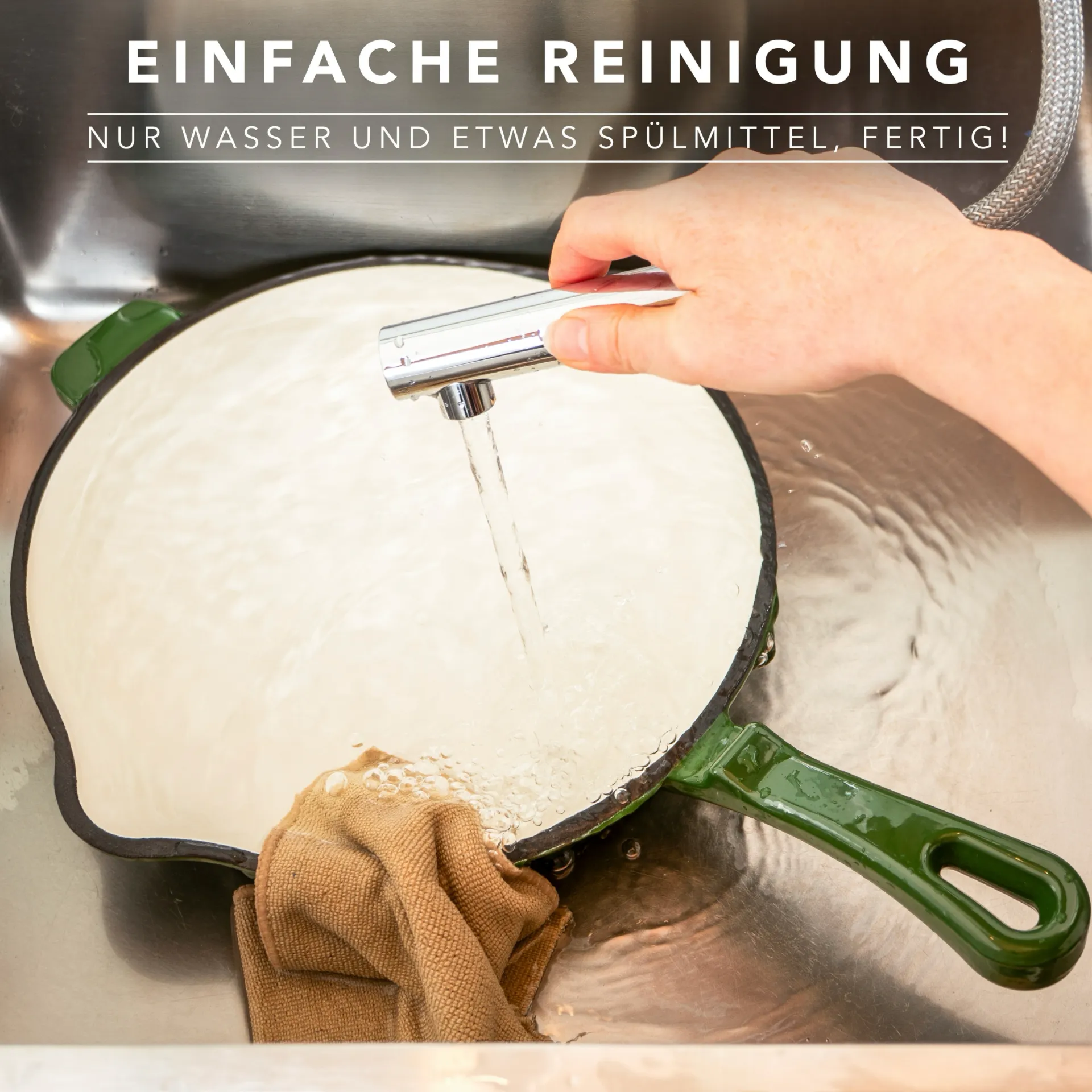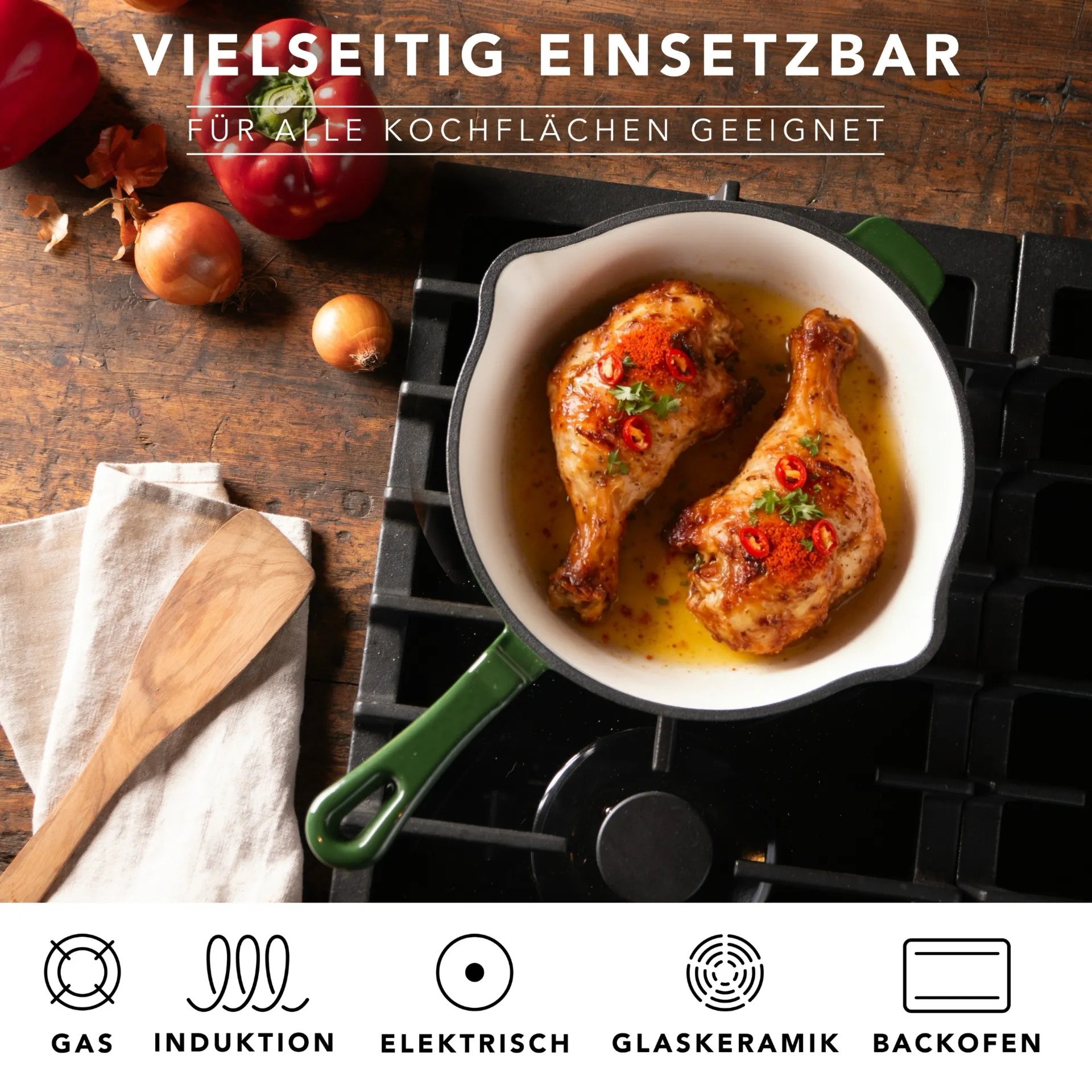 Die hochwertige Emaille-Beschichtung macht die Pfanne sofort einsatzbereit – ohne Einbrennen. Speisen haften kaum an, und die Reinigung gelingt mühelos. Gleichzeitig schützt die Emaille das Gusseisen vor Rost und ist frei von PFAS, PTFE und Nickel.