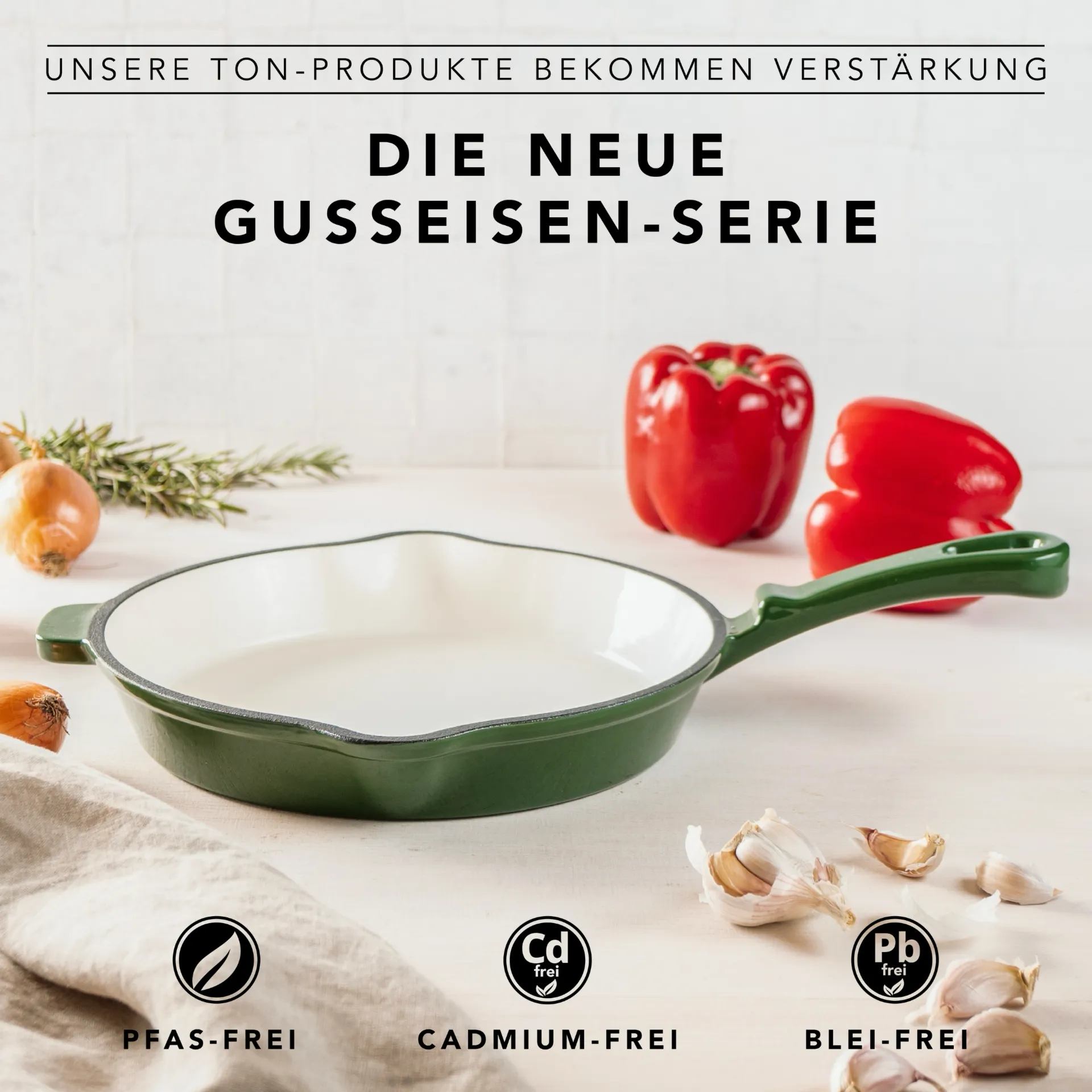 In zwei Größen (24 cm und 28 cm) und drei Farben (Grün, Creme, Anthrazit) passt die Bratpfanne zu jedem Kochstil und jeder Küche. Sie ist Teil der Gusseisen-Serie von Römertopf und ergänzt sich perfekt mit den Töpfen, der Schmorpfanne und der Grillpfanne.