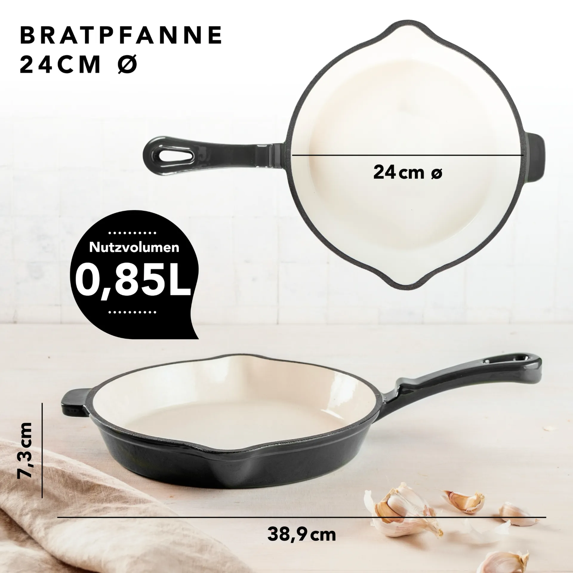 Die 24-cm-Bratpfanne ist der kompakte Allrounder für 1–2 Portionen: ein Steak, zwei Fischfilets, eine Portion Bratkartoffeln oder ein Spiegelei-Frühstück. Sie ist wendig, leichter als die große Variante und perfekt für den schnellen Einsatz unter der Woche.