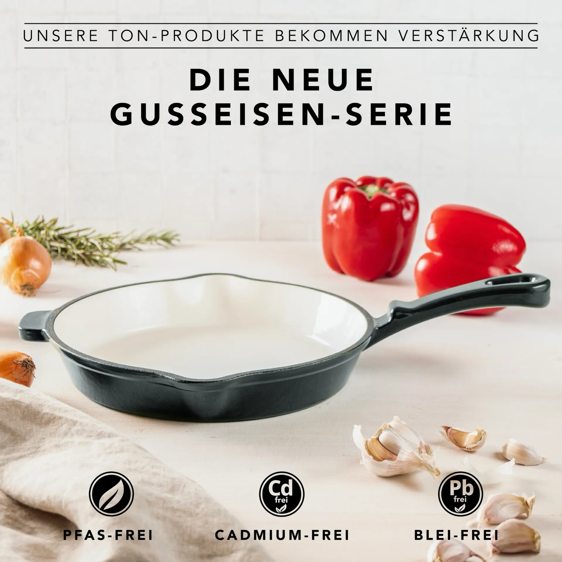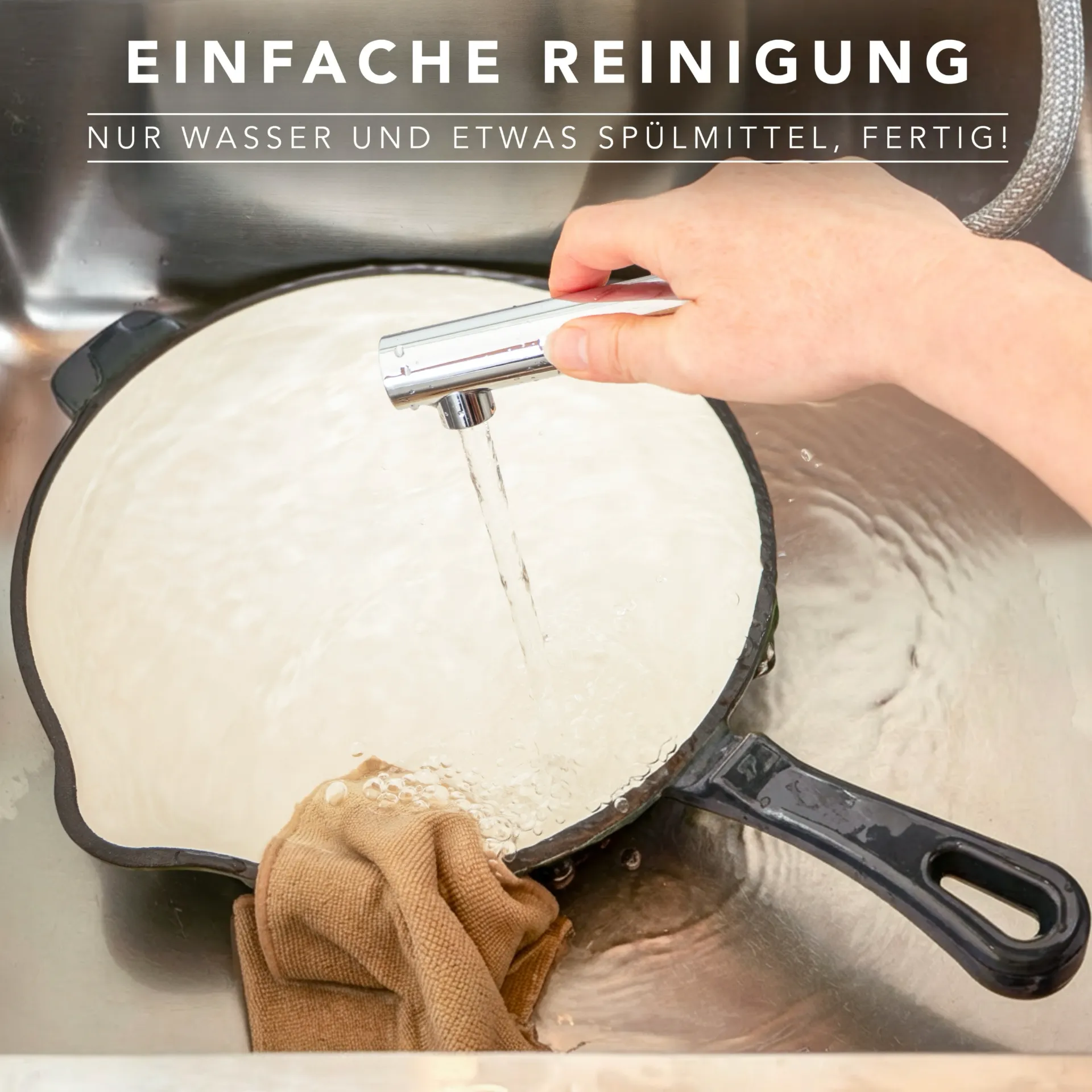 Die hochwertige Emaille-Beschichtung macht die Pfanne sofort einsatzbereit – ohne Einbrennen. Speisen haften kaum an, und die Reinigung gelingt mühelos. Gleichzeitig schützt die Emaille das Gusseisen vor Rost und ist frei von PFAS, PTFE und Nickel.
