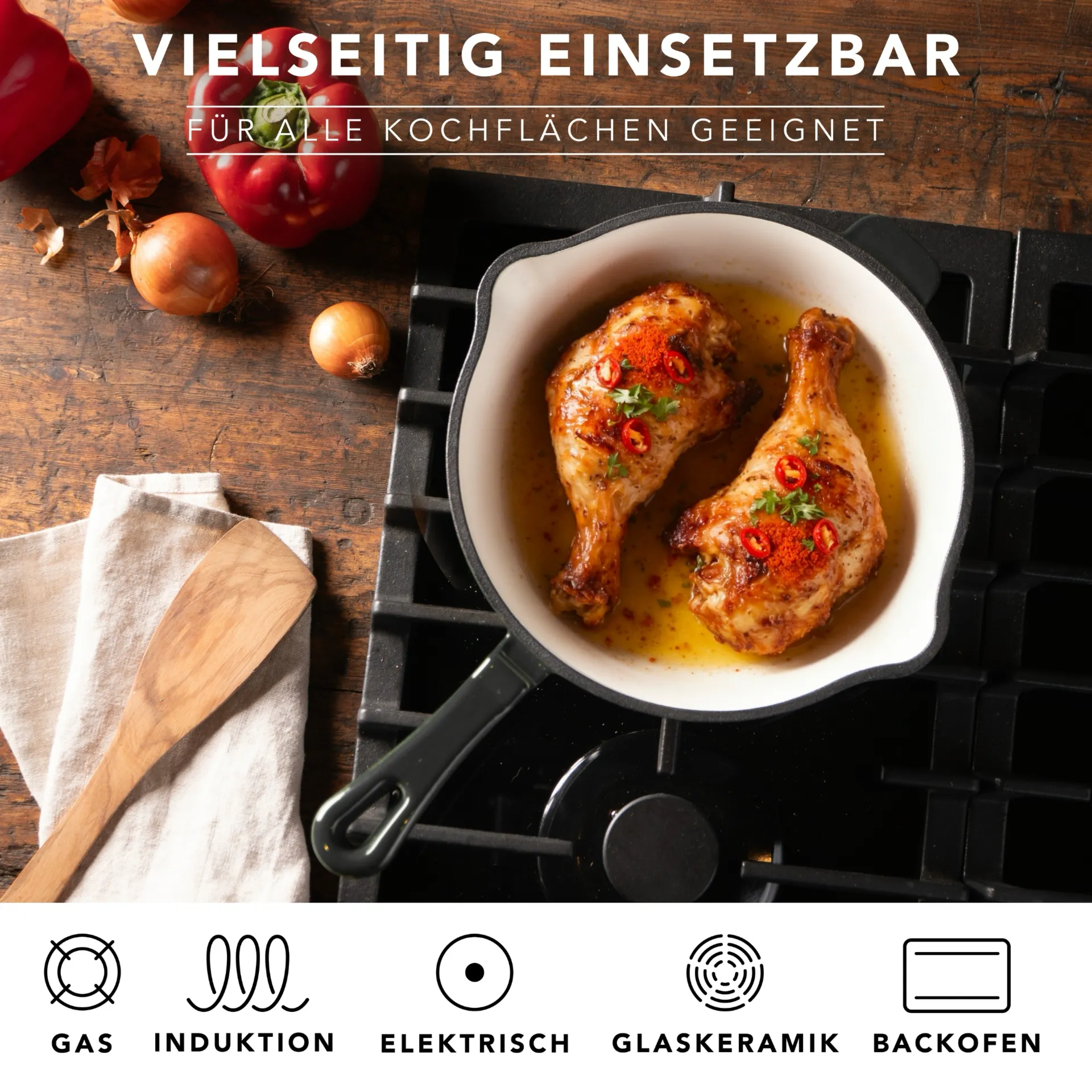 Die Bratpfanne funktioniert auf Induktion, Gas, Ceran, Elektro und Halogen. Im Backofen ist sie bis 250 °C einsetzbar. Damit lassen sich Techniken umsetzen, die mit herkömmlichen Pfannen nicht möglich sind: Steak auf dem Herd scharf anbraten, dann die ganze Pfanne in den Ofen schieben und bei 180 °C auf die gewünschte Kerntemperatur bringen. Oder eine Frittata auf dem Herd starten und unter dem Grill überbacken.