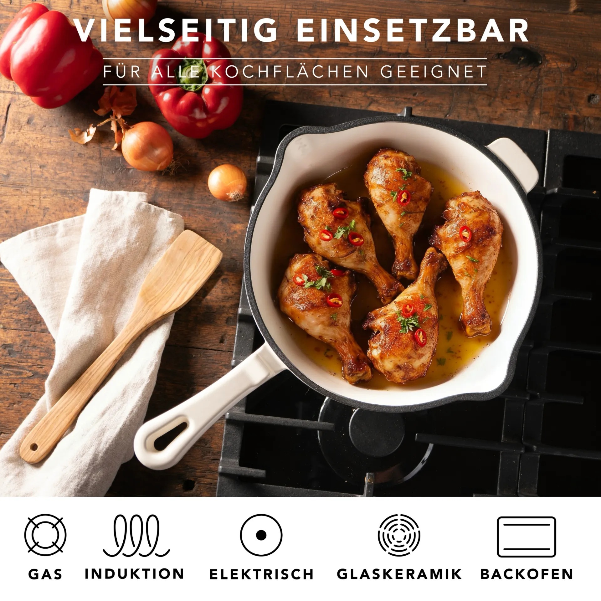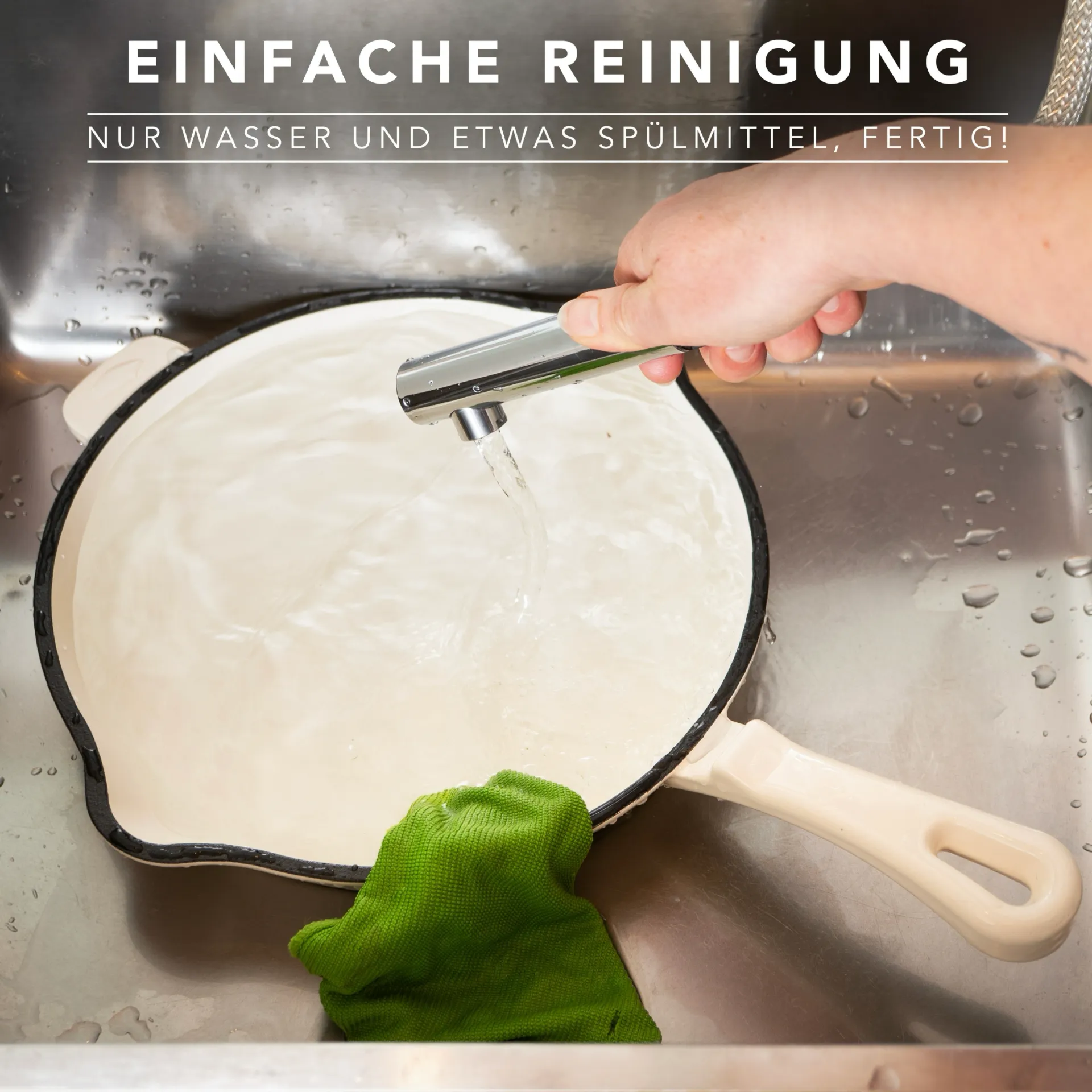 Die hochwertige Emaille-Beschichtung macht die Pfanne sofort einsatzbereit – ohne Einbrennen. Speisen haften kaum an, und die Reinigung gelingt mühelos. Gleichzeitig schützt die Emaille das Gusseisen vor Rost und ist frei von PFAS, PTFE und Nickel.