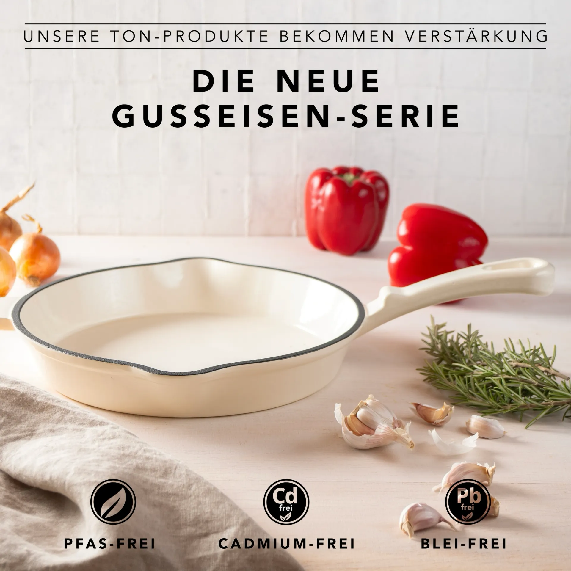 In zwei Größen (24 cm und 28 cm) und drei Farben (Grün, Creme, Anthrazit) passt die Bratpfanne zu jedem Kochstil und jeder Küche. Sie ist Teil der Gusseisen-Serie von Römertopf und ergänzt sich perfekt mit den Töpfen, der Schmorpfanne und der Grillpfanne.