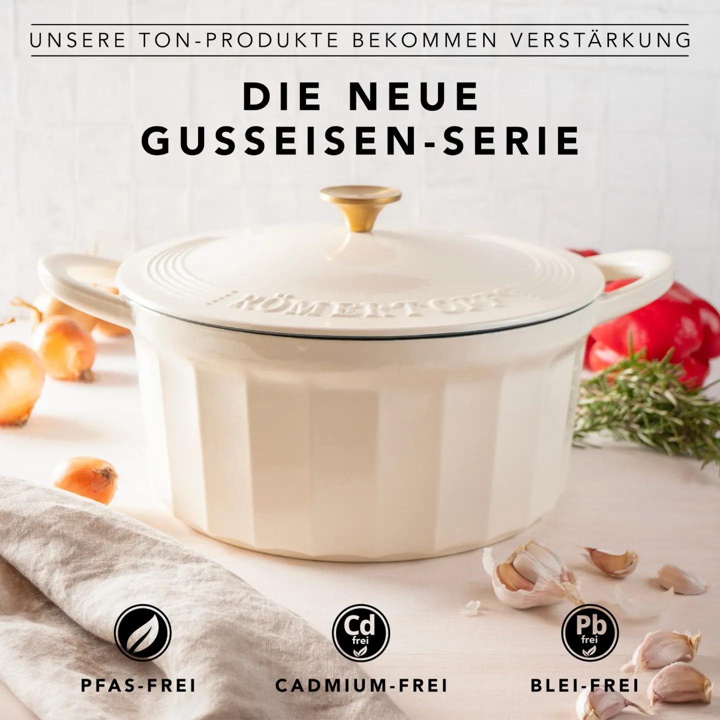 Emailliertes Gusseisen hat eine glatte, versiegelte Oberfläche: kein Einbrennen nötig, kein Rost, keine Geschmacksübertragung und einfache Reinigung. Unbeschichtetes Gusseisen muss regelmäßig eingebrannt werden. Beide bieten die gleiche Wärmespeicherung – die emaillierte Version ist jedoch pflegeleichter. Die Emaille der Römertopf-Serie ist frei von PFAS, PTFE und Nickel.