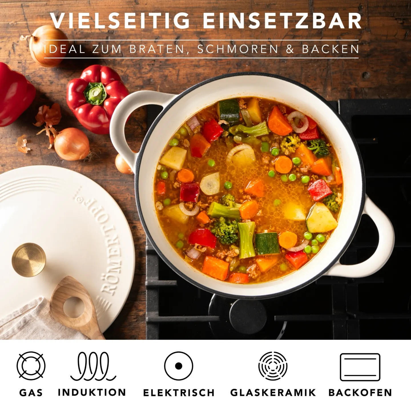 Ob auf dem Ceranfeld, Gasherd oder Induktionskochfeld – der Topf ist für alle Herdarten geeignet und darf bedenkenlos in den Backofen. Damit ist er die ideale Wahl für alle, die ein langlebiges, pflegeleichtes Kochgeschirr suchen, das in der Küche keine Kompromisse eingeht. Entdecken Sie die gesamte Gusseisen-Serie von Römertopf.