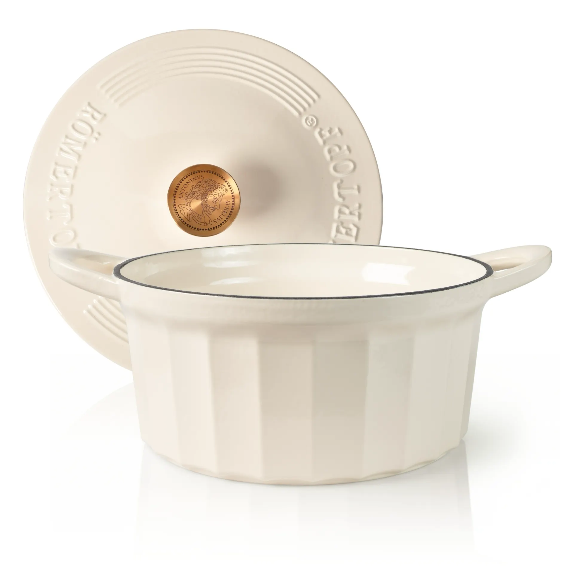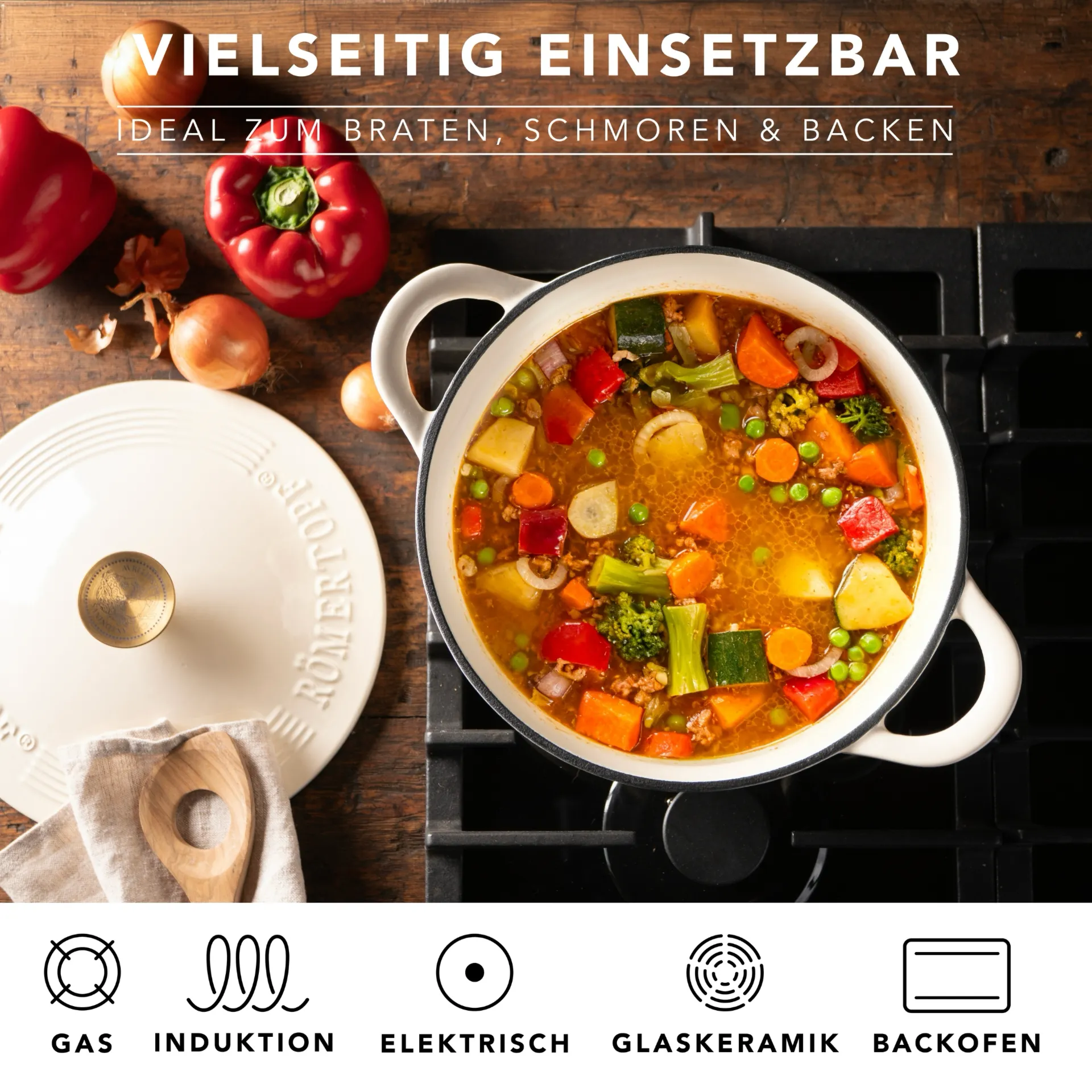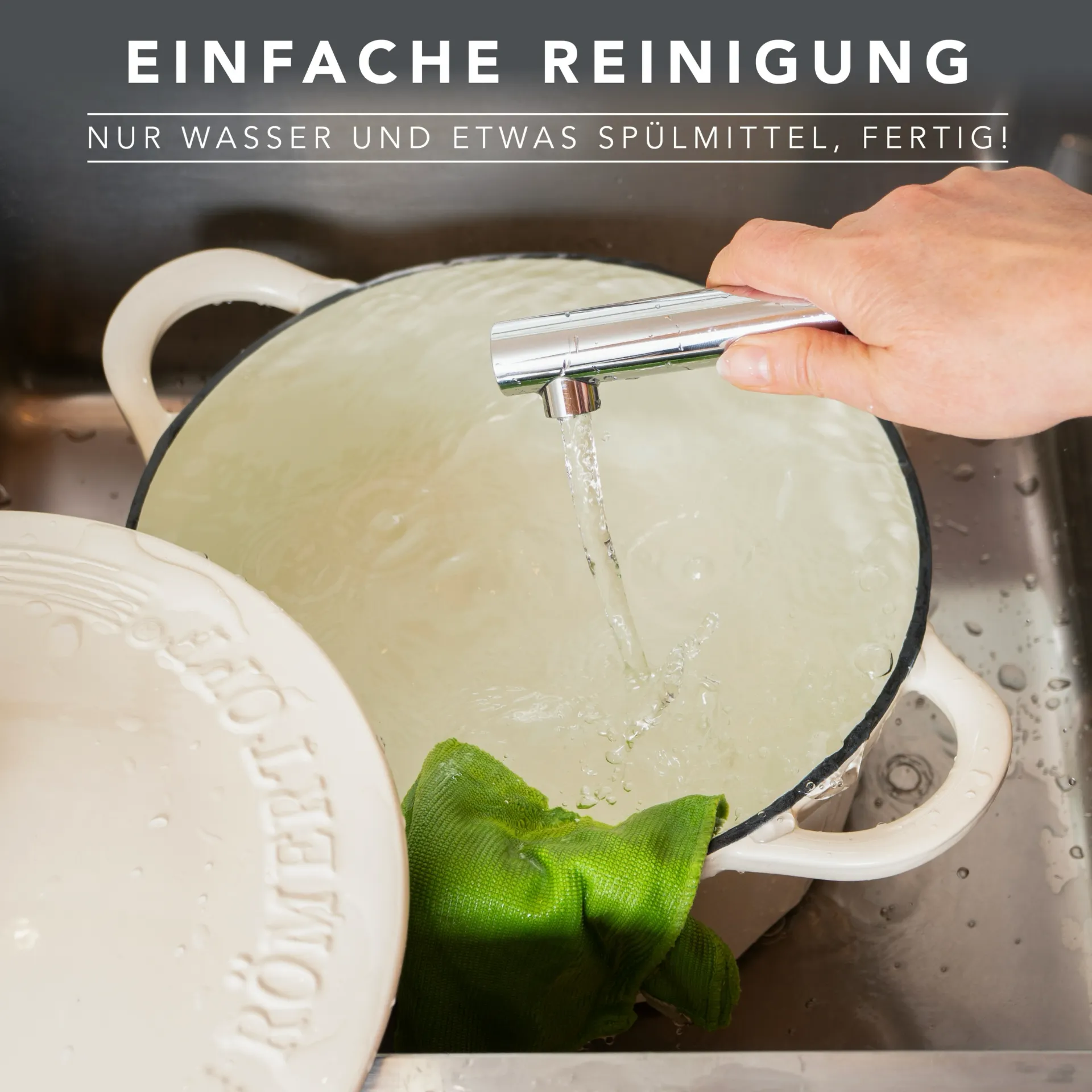 Gusseisernes Kochgeschirr hat eine jahrhundertealte Tradition und gilt bis heute als eines der vielseitigsten Materialien in der Küche. Der Gusseisen Topf von Römertopf verbindet diese bewährte Qualität mit einer hochwertigen Emaille-Beschichtung, die das Kochen noch komfortabler macht. Ob langsam geschmorter Rinderbraten, ein deftiger Eintopf oder frisch gebackenes Brot direkt aus dem Ofen – die gleichmäßige Wärmeverteilung und die hervorragende Wärmespeicherung sorgen dafür, dass jedes Gericht perfekt gelingt.