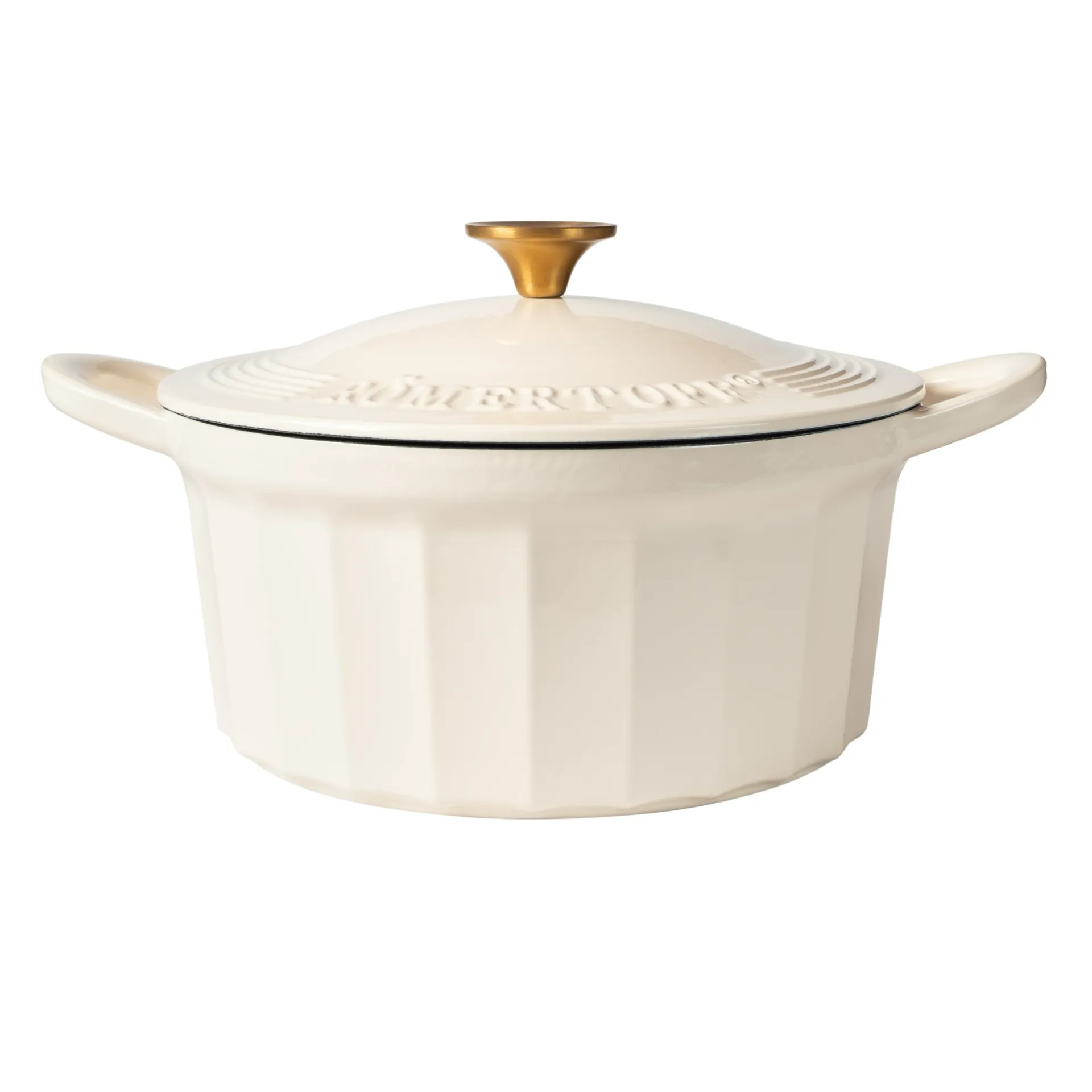 Massives Gusseisen trifft auf hochwertige Emaille – dieser Topf vereint die besten Eigenschaften beider Materialien in einem vielseitigen Kochgeschirr. Die schwere Konstruktion speichert Wärme besonders lang und gibt sie gleichmäßig an das Gargut ab. So gelingen Schmorgerichte, Braten, Eintöpfe und sogar frisch gebackenes Brot mit hervorragenden Ergebnissen.
