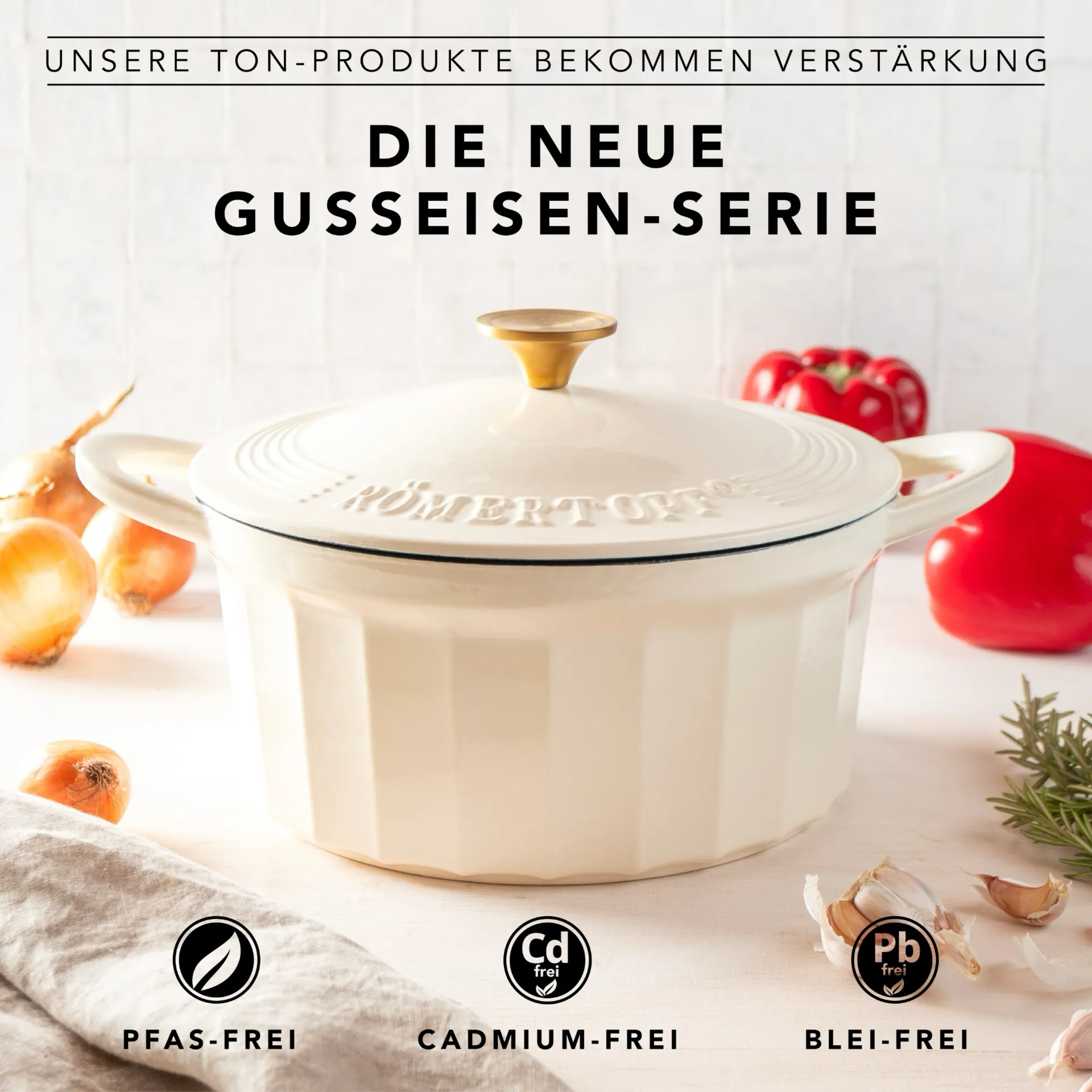 Emailliertes Gusseisen hat eine glatte, versiegelte Oberfläche: kein Einbrennen nötig, kein Rost, keine Geschmacksübertragung und einfache Reinigung. Unbeschichtetes Gusseisen muss regelmäßig eingebrannt werden. Beide bieten die gleiche Wärmespeicherung – die emaillierte Version ist jedoch pflegeleichter. Die Emaille der Römertopf-Serie ist frei von PFAS, PTFE und Nickel.
