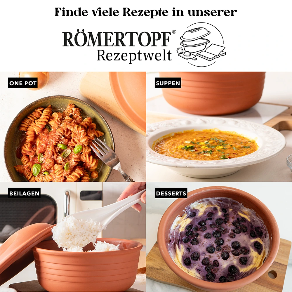 Tradition trifft Funktion – Römertopf Rustico für bis zu 4 PersonenMit dem Bräter Rustico 3 Liter setzt Römertopf auf bewährte Tonqualität und charaktervolles Design. Das Modell ist ideal für alle, die gerne unkompliziert, aromatisch und mit natürlichen Zutaten im Ofen garen – ob Auflauf, Fleischgericht oder Gemüse-Kreation. Alles kommt in einem Schritt in den Bräter, wird in den Ofen geschoben und gleichmäßig gegart. Einfach, effizient und ohne ständiges Nachschauen.Die liebevoll gestalteten Naturmotive auf dem Deckel – mit Huhn, Kuh und Ackerfrüchten – unterstreichen den rustikalen Stil und machen den Bräter auch optisch zu einem Blickfang. Perfekt geeignet für Haushalte mit bis zu vier Personen.Ofenfrische Gerichte – ganz einfach zubereitetMit einem Fassungsvermögen von 3 Litern bietet der mittlere Rustico-Bräter ausreichend Platz für abwechslungsreiche Rezepte. Er ist sowohl für traditionelle als auch moderne Küchen geeignet und überzeugt durch langlebige Verarbeitung sowie die typischen Eigenschaften des Römertopf-Tons: gleichmäßige Wärmeverteilung und zuverlässige Garergebnisse.Die Reinigung gelingt mühelos per Hand oder in der Spülmaschine – damit der Bräter schnell wieder einsatzbereit ist. So wird die Zubereitung im Alltag besonders praktisch.
