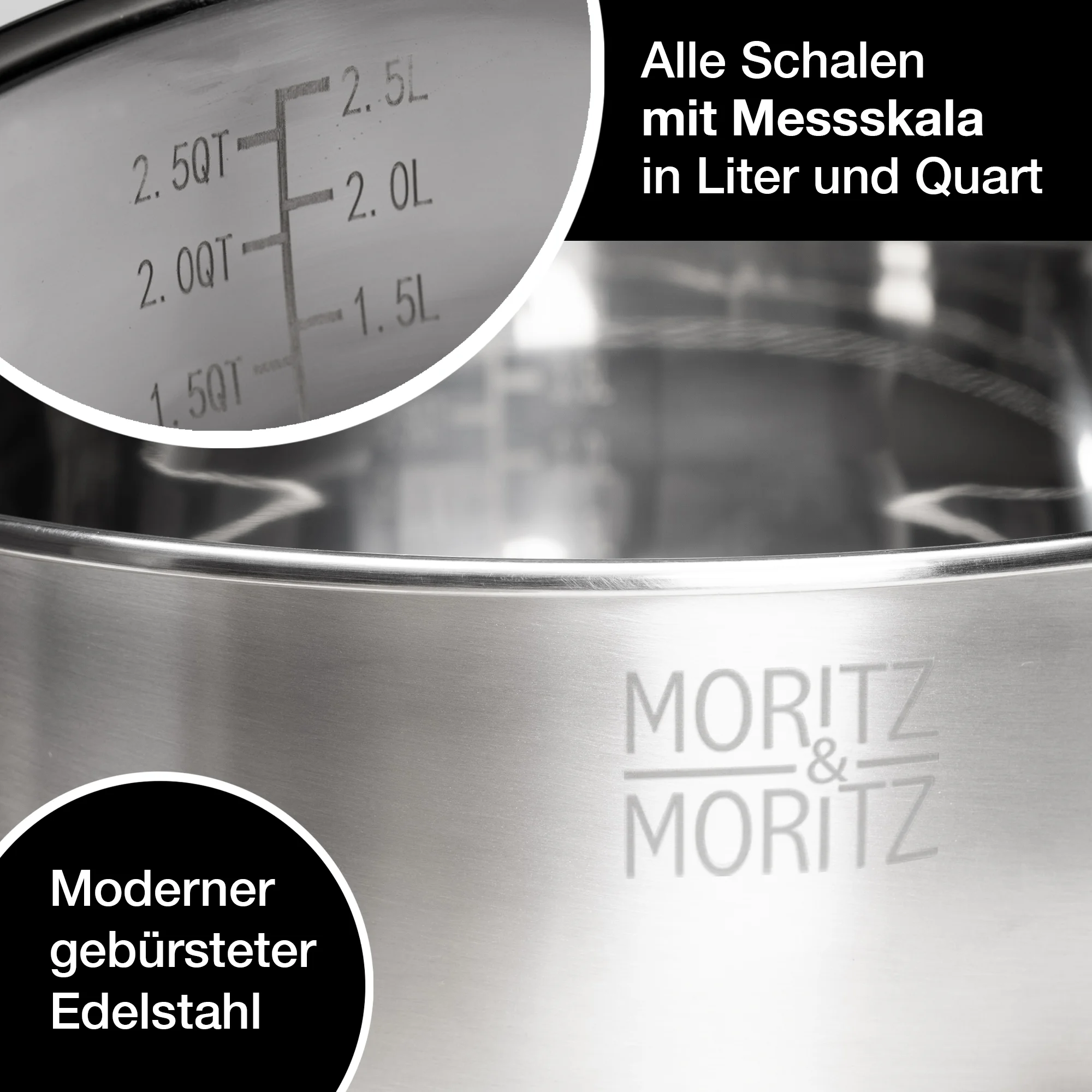 Das 5-teilige Rührschüssel-Set von Moritz & Moritz ist der ideale Helfer beim Kochen und Backen. Mit Größen von Ø 13,5 bis 25,5 cm und einem Volumen von 0,6 bis 4,5 Litern bist du bestens für kleine Portionen oder große Mischungen ausgestattet. Gefertigt aus hochwertigem, rostfreiem Edelstahl vereint das Set Langlebigkeit, Stil und Funktionalität.