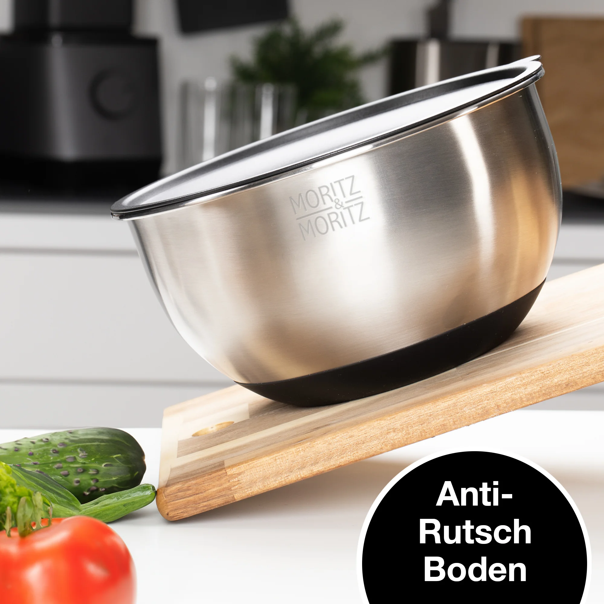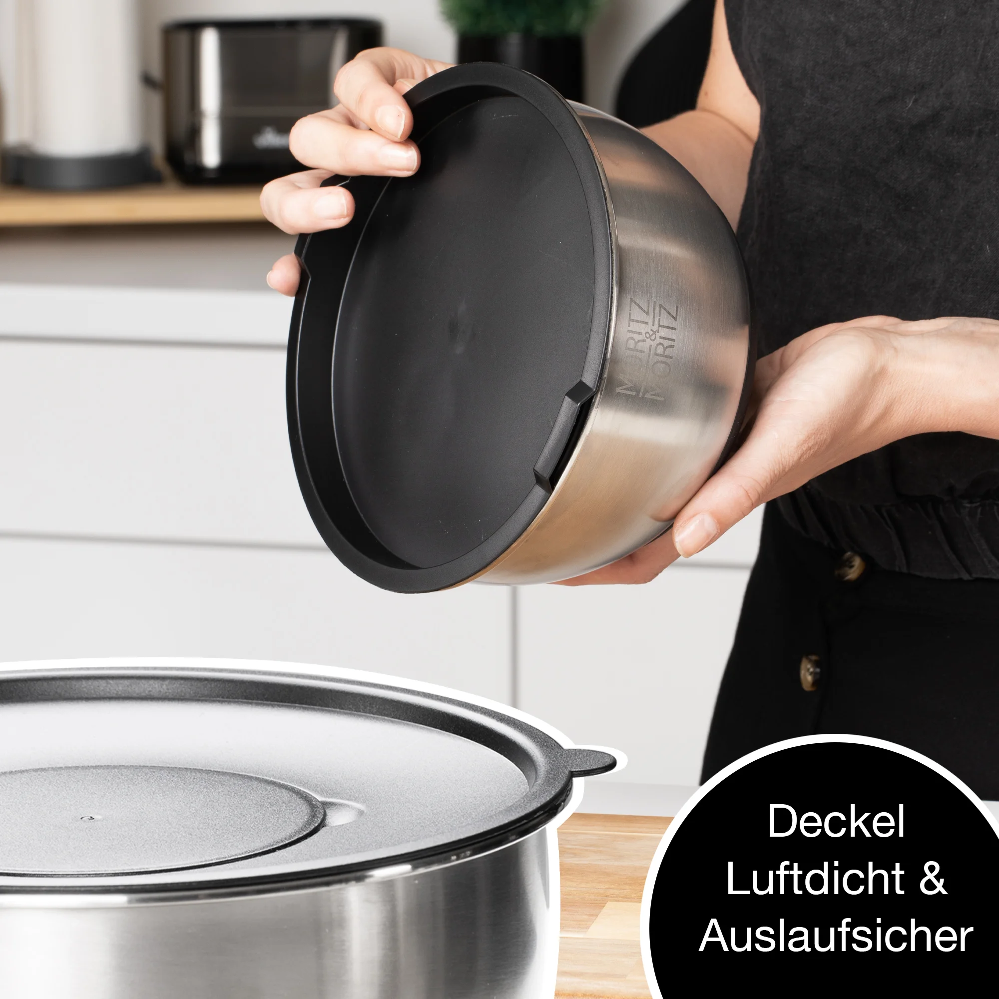 Dank der rutschfesten Böden bleiben die Schüsseln beim Arbeiten stabil. Luftdichte Deckel mit integrierter Dichtung halten Speisen länger frisch und verhindern Auslaufen. Die praktischen Messskalen im Inneren ermöglichen dir exaktes Abmessen direkt in der Schüssel – ganz ohne zusätzliches Zubehör.