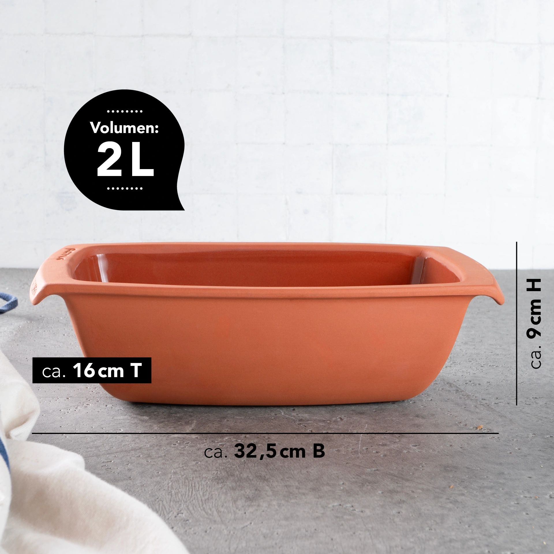 Dank des hochwertigen Tons sorgt die Kastenform für eine gleichmäßige Wärmeverteilung, wodurch Ihre Brote und Kuchen innen luftig und außen schön knusprig werden. Mit einem Fassungsvermögen von zwei Litern ist die Form ideal für Brote bis zu 1000 Gramm geeignet, kann aber auch für Kuchen verwendet werden.