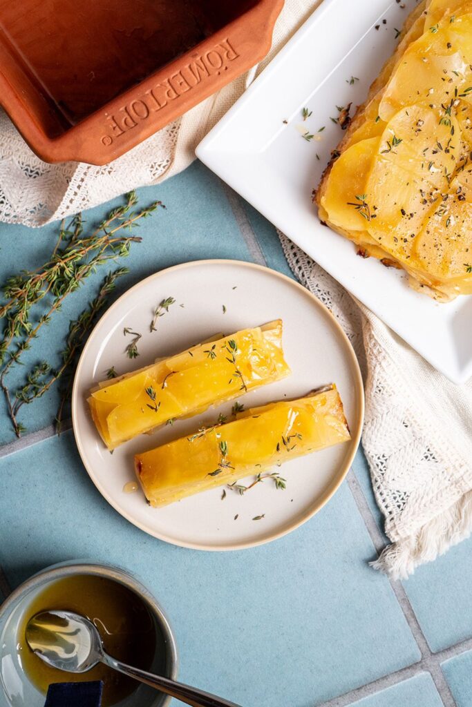 Ist die Torte fertig geschichtet, wird das überstehende Backpapier locker über die Oberfläche geklappt und die Form in den kalten Backofen gestellt. Diese Methode ist typisch für die schonende Zubereitung in Tontöpfen: Die Form heizt gemeinsam mit dem Ofen auf und verhindert Temperaturschocks. Bei 180 °C Ober-/Unterhitze gart die Torte rund 60 Minuten, bis die Kartoffeln durchgegart und weich sind. Danach wird das Backpapier geöffnet, die Temperatur auf 200–210 °C erhöht und die Torte weitere 20–25 Minuten gebacken. In dieser zweiten Phase entsteht die goldbraune, leicht knusprige Oberfläche, die den besonderen Reiz des Gerichts ausmacht. Nach dem Backen braucht die Torte unbedingt eine Ruhezeit von mindestens 15–20 Minuten, damit sie sich setzen kann und beim Schneiden ihre schöne Form behält. Mit Hilfe des Backpapiers lässt sich die Torte vorsichtig aus der Form heben, stürzen und in saubere Scheiben schneiden. Serviert mit einem Hauch frischem Thymian und einer Prise schwarzem Pfeffer wird sie zum Highlight auf jedem Tisch.