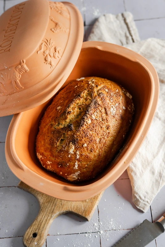 Der Römertopf bietet ideale Bedingungen für das Backen dieses Brotes. Der Ton nimmt beim Aufheizen Feuchtigkeit auf und gibt sie im Backprozess gleichmäßig ab. Dadurch entsteht im Inneren des Bräters ein natürlicher Dampf, der das Brot schön aufgehen lässt und gleichzeitig eine knusprige Kruste formt. Durch den geschlossenen Deckel gelingt der Backvorgang gleichmäßig – das Ergebnis ist eine rustikale, goldene Kruste und eine lockere, saftige Krume.