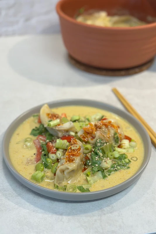 Die Sauce aus Kokosmilch, roter Currypaste, Zitrone und Sojasauce ist mild-würzig, leicht cremig und wunderbar ausgewogen. Die Dumplings nehmen die Aromen direkt auf, während das Gemüse knackig bleibt. Abgerundet mit Crispy Chili Öl, Sesam und Frühlingszwiebeln entsteht ein modernes One-Pot-Gericht, das in wenigen Minuten auf dem Tisch steht und trotzdem wie Comfort Food schmeckt.