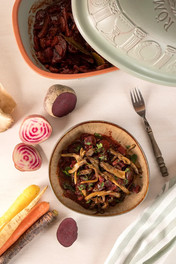 Dieser Wurzelzauber à la Bourguignon ist ein aromatisches Schmorgericht, das an den französischen Klassiker Bourguignon erinnert – nur eben als Gemüsevariante aus dem Römertopf. Verschiedene Wurzelgemüse wie Bete, Pastinake, Petersilienwurzel und Topinambur verbinden sich beim langsamen Schmoren mit Rotwein, Tomatenmark, Kräutern und Pilzen zu einer tiefwürzigen, dunklen Sauce. Das Ergebnis schmeckt herzhaft, rund und perfekt „winterküchentauglich“.