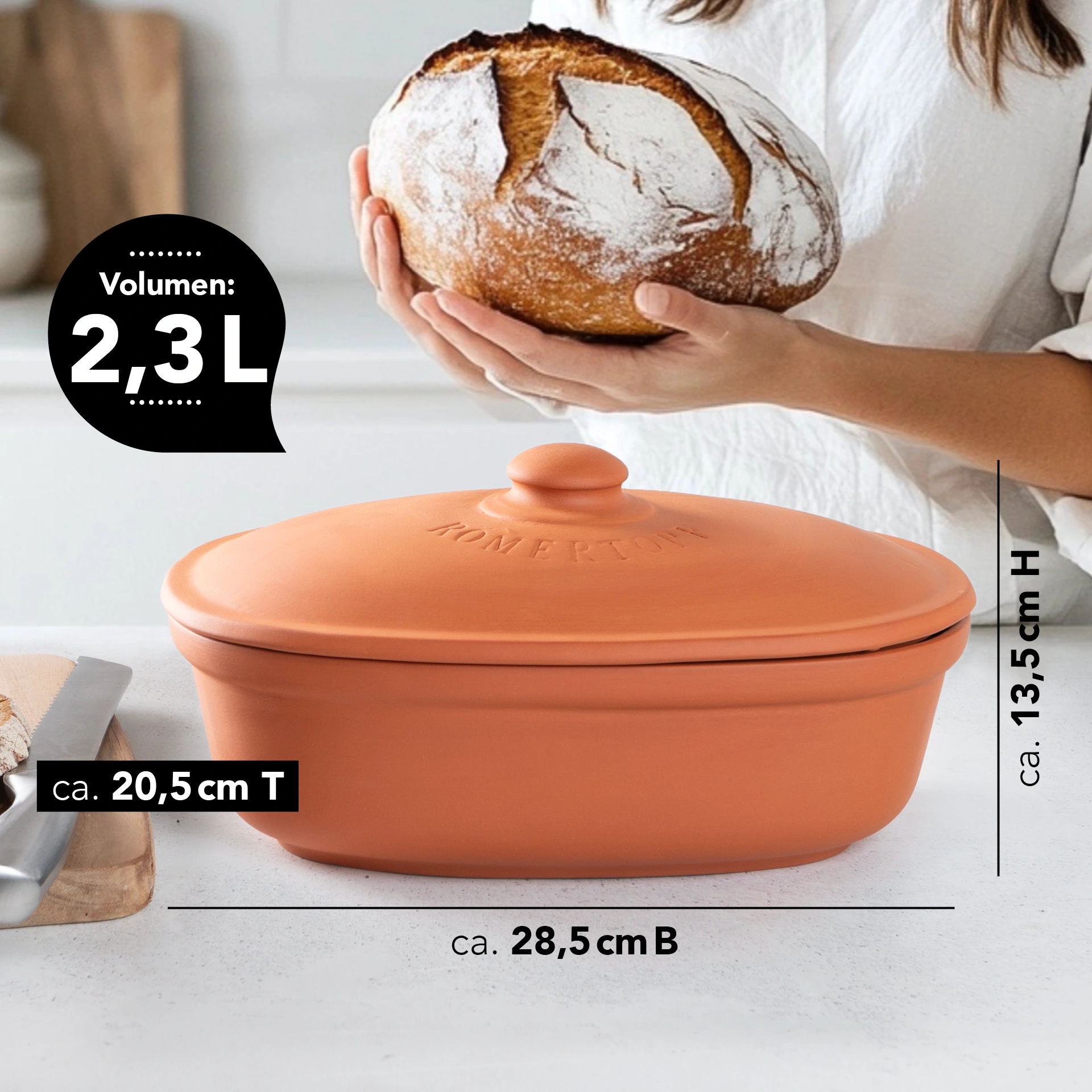 Dieser Brottopf in ovaler Form ist speziell für kleine bis mittlere Haushalte entwickelt. Er bietet ausreichend Platz, um Brot und Brötchen frisch und saftig zu halten. Der atmungsaktive Ton des Römertopfs wirkt wie eine natürliche Klimaanlage: Er reguliert die Feuchtigkeit, indem er überschüssige Feuchtigkeit nach außen ableitet. Dadurch wird Schimmelbildung effektiv verhindert, und trockenes Brot gehört der Vergangenheit an. So bleibt Ihr Brot länger aromatisch und genussbereit.