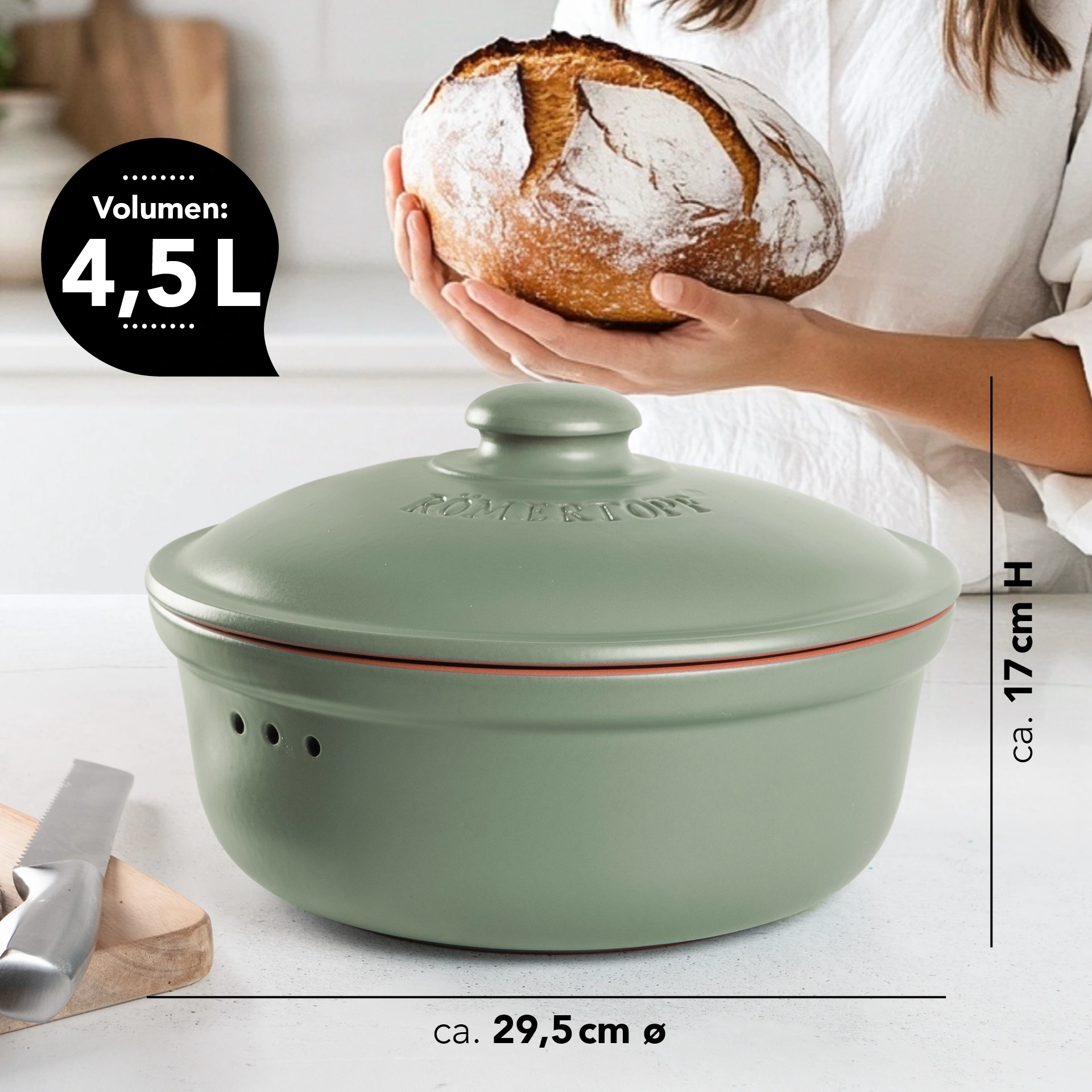 Römertopf Brot- und Kuchenbackform rund – Für aromatische Laibe und saftige Kuchen Die runde Brot- und Kuchenbackform von Römertopf ist der perfekte Begleiter für alle, die gerne Brot wie vom Bäcker oder kreative Kuchenideen zu Hause umsetzen möchten. Hergestellt aus naturbelassenem Ton, sorgt sie für eine gleichmäßige Hitzeverteilung und ein optimales Backergebnis – ob beim rustikalen Bauernbrot oder beim süßen Klassiker. Saftiges Brot mit rustikaler Kruste Besonders geeignet ist die Form für runde Laibe im Landbrot-Stil, die direkt auf dem Tisch nicht nur geschmacklich, sondern auch optisch überzeugen. Die Tonform sorgt dafür, dass das Brot gleichmäßig gegart, aromatisch und außen schön knusprig wird – mit einer Textur, die man schmeckt und hört. Auch für Kuchen bestens geeignet Die Backform lässt sich vielseitig einsetzen: Neben Brot gelingt darin auch ein saftiger Kuchen, der durch die gleichmäßige Wärmeverteilung des Tons besonders locker und gleichmäßig gebräunt aus dem Ofen kommt. Robust, spülmaschinengeeignet & langlebig Nach dem Backen lässt sich die Form leicht reinigen – entweder von Hand oder in der Spülmaschine. Die hochwertige Verarbeitung macht sie besonders langlebig und bereit für viele Backrunden.