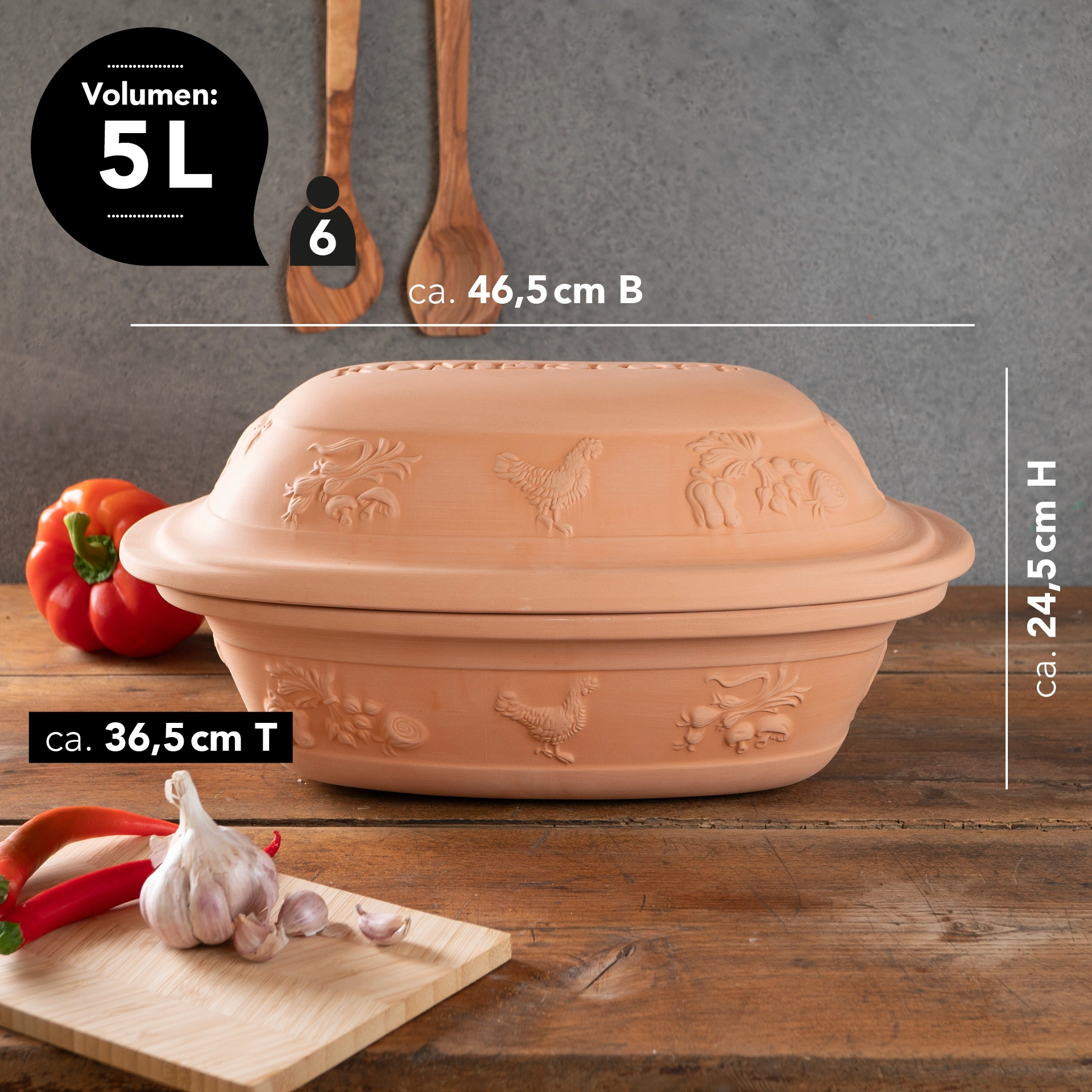 Römertopf 50 Jahre Jubiläums-Bräter für bis zu 8 Personen Erleben Sie Kochtradition auf höchstem Niveau mit dem Römertopf 50 Jahre Jubiläums-Bräter, der größten Variante unserer Jubiläumsreihe. Dieser Bräter ist ideal für gesellige Runden und große Familienessen, da er mühelos Mahlzeiten für bis zu acht Personen zubereiten kann. Mit einem großzügigen Fassungsvermögen von bis zu sechs Kilogramm sorgt er dafür, dass alle Gäste satt und zufrieden den Tisch verlassen. Perfekte Garung und Geschmackserlebnis Der Jubiläumsbräter sorgt dafür, dass alle Zutaten gleichzeitig perfekt gegart werden, sodass jedes Gericht direkt vom Ofen auf den Tisch serviert werden kann. Die natürliche Tonmaterialien garantieren, dass die Speisen ihren ursprünglichen Geschmack bewahren. Das Ergebnis ist ein unvergleichliches Geschmackserlebnis, das Ihre Gäste begeistern wird.